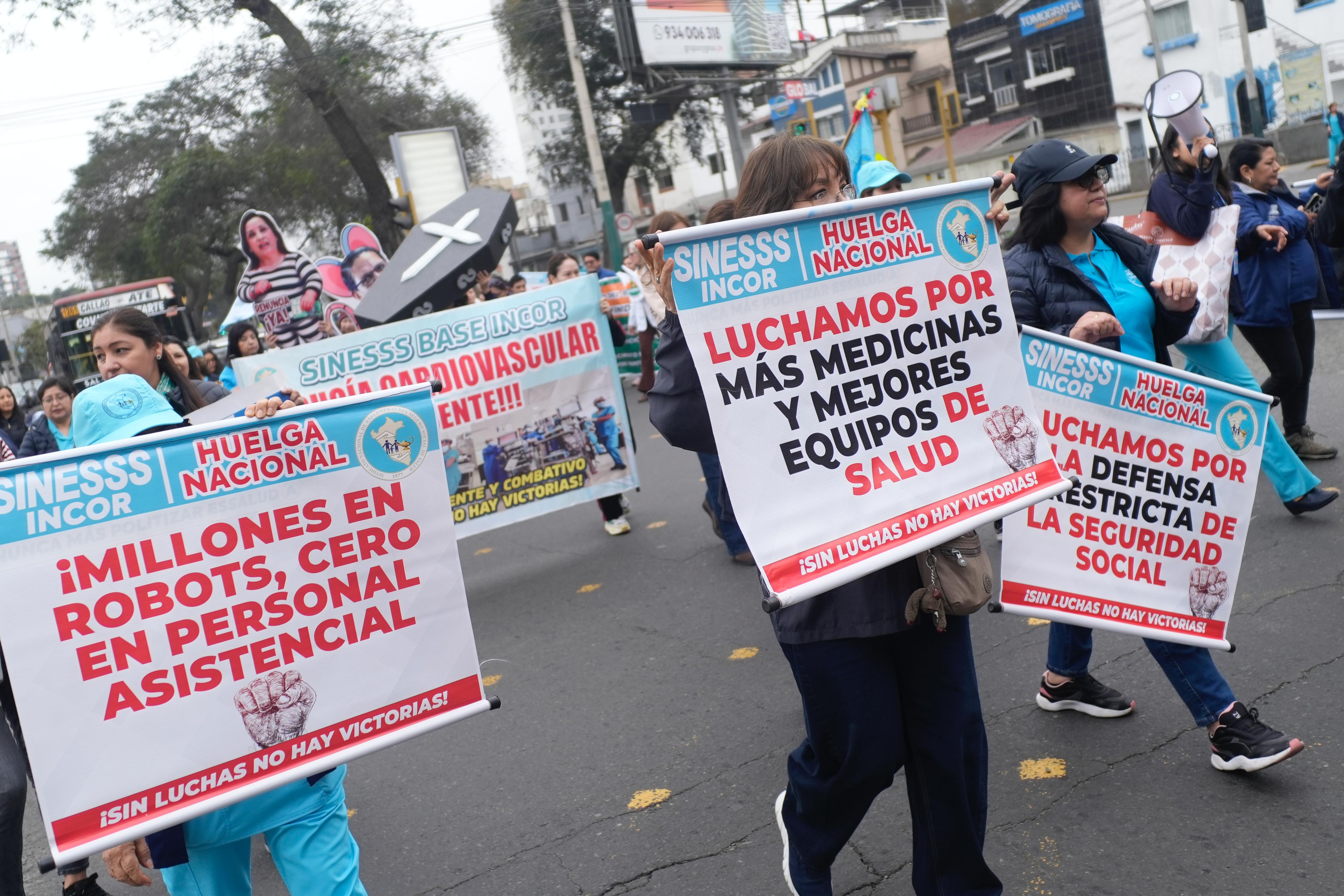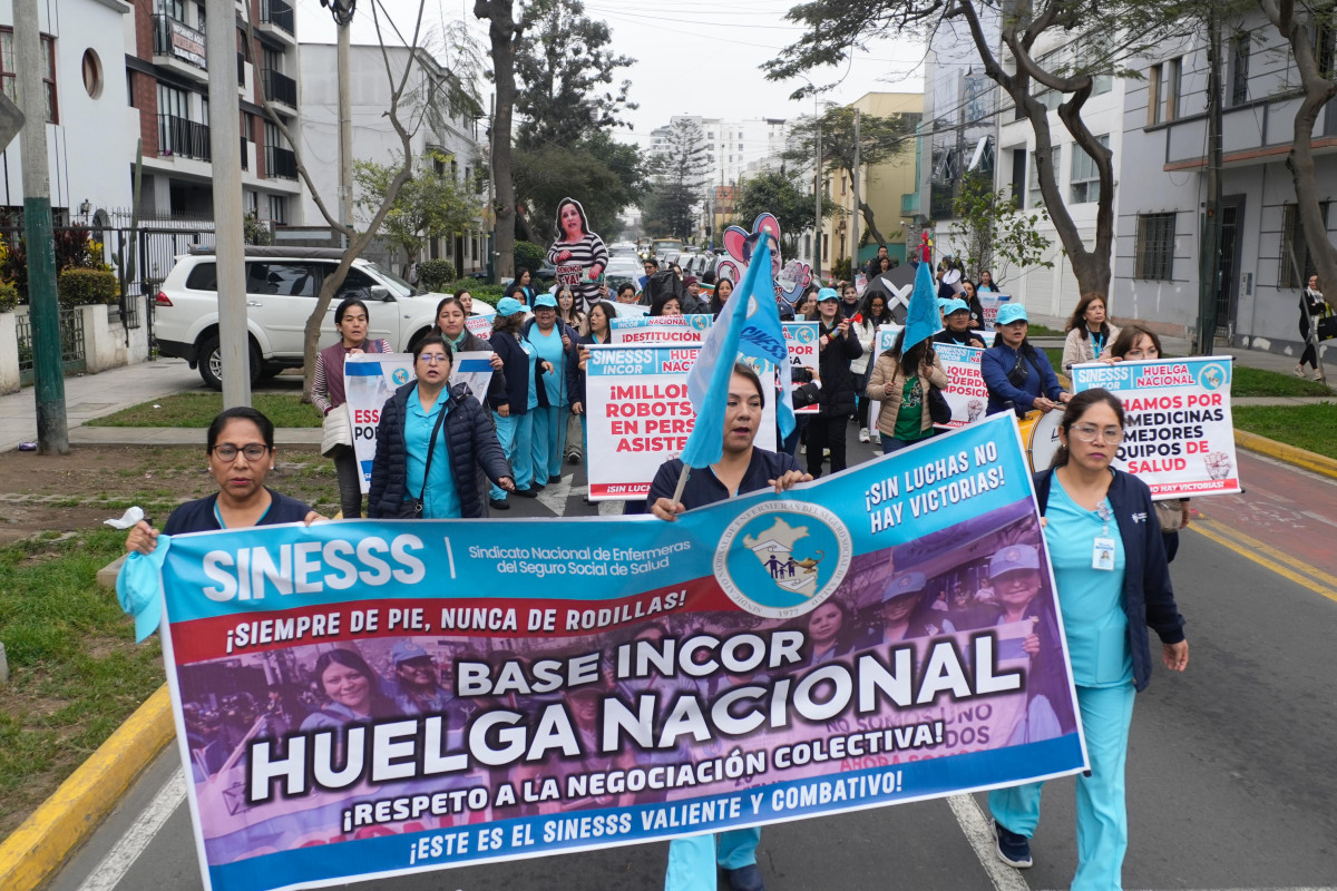 El Sindicato Nacional de Enfermeras del Seguro Social de Salud (SINESS) del Instituto Nacional Cardiovascular (Incor) inició la movilización portando carteles y pancartas con mensajes que reclaman más medicinas, mejores equipos y mayor personal asistencial, entre otras demandas del sector.