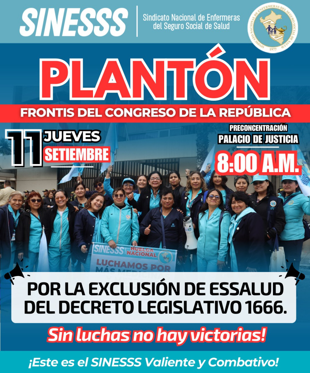 El Sindicato Nacional de Enfermeras del Seguro Social de Salud (Sinesss) convocó a un plantón frente al Congreso de la República, exigiendo la exclusión de EsSalud del Decreto Legislativo 1666, que consideran amenaza la autonomía y el futuro de la Seguridad Social. En provincias, las manifestaciones se realizarán de manera simultánea en la Plaza de Armas de cada ciudad, como parte de esta jornada de protesta nacional.