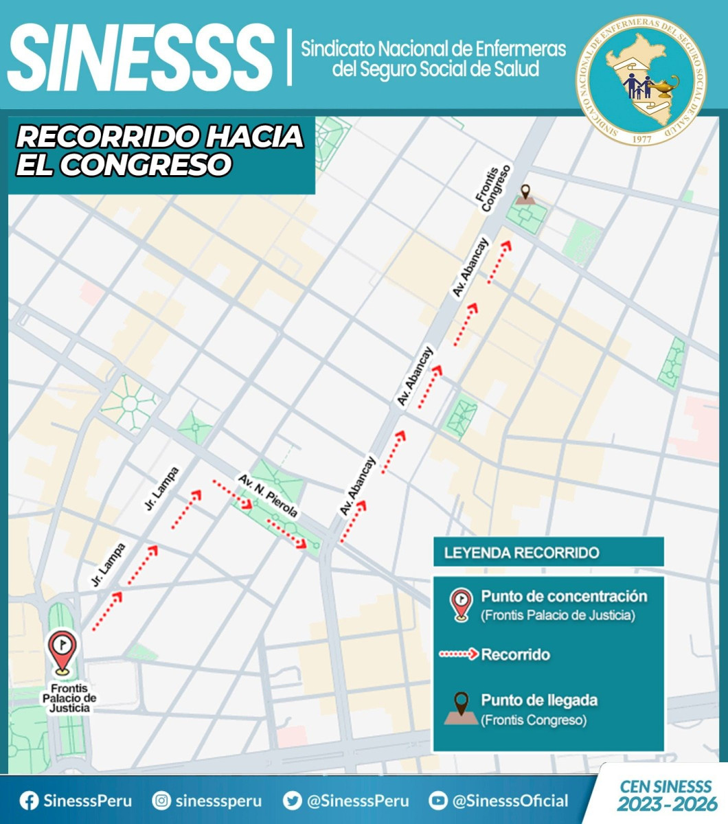 El Sindicato Nacional de Enfermeras convoca a una concentración frente al Palacio de Justicia a las 8:00 a.m., desde donde partirán en movilización hacia el Congreso de la República en Lima. El recorrido oficial será por el Jr. Lampa, luego Av. Nicolás de Piérola, continuando por la Av. Abancay hasta llegar al frontis del Congreso.