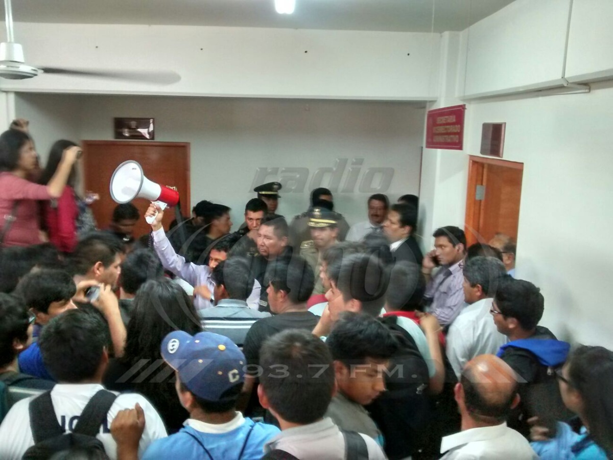 El hecho motivó que el rector Miguel Ángel Larrea Céspedes y el vicerrector académico Ramón Vera tengan que prácticamente lanzarse por la ventana del lugar para luego ser sacados en una ambulancia, pero el vehículo fue impedido de avanzar pues los manifestantes obstruyeron el paso con materiales de construcción que se hallaban en la zona. En aquel momento, -en comunicación con Radio Uno- el comandante de los bomberos, Wilber Leyva, dio a conocer que la ambulancia terminó con las ventanas destruidas.