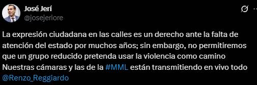 El presidente José Jerí se pronunció a través de su cuenta de X (exTwitter) por las fuertes protestas que se vienen desarrollando en el Centro de Lima.