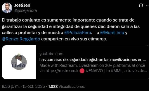 Pasada una hora, el Jefe de Estado envió un segundo mensaje a través de X: “El trabajo conjunto es sumamente importante cuando se trata de garantizar la seguridad e integridad de quienes decidieron salir a las calles a protestar y de nuestra Policía. La Municipalidad de Lima y Renzo Reggiardo comparten en vivo sus cámaras”.