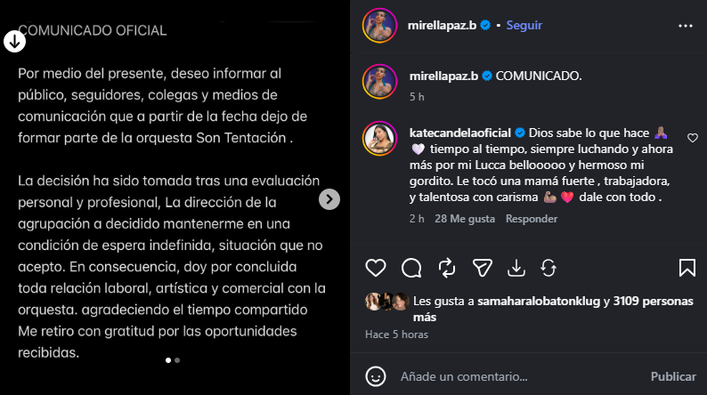 Mirella Paz ya no va más en Son Tentación y no, no fue por “mutuo acuerdo” ni por “nuevos rumbos” así nomás. La cantante decidió dar un paso al costado y lo dejó clarísimo en un comunicado que, entre líneas, dice mucho más de lo que aparenta.