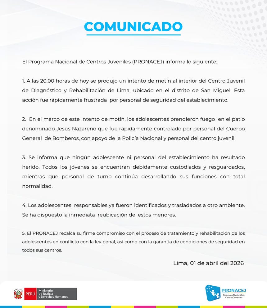 Asimismo, Pronacej señaló que los adolescentes involucrados fueron identificados y trasladados a otro ambiente. “Se ha dispuesto la inmediata reubicación de estos menores”, concluyó la institución en su comunicado.